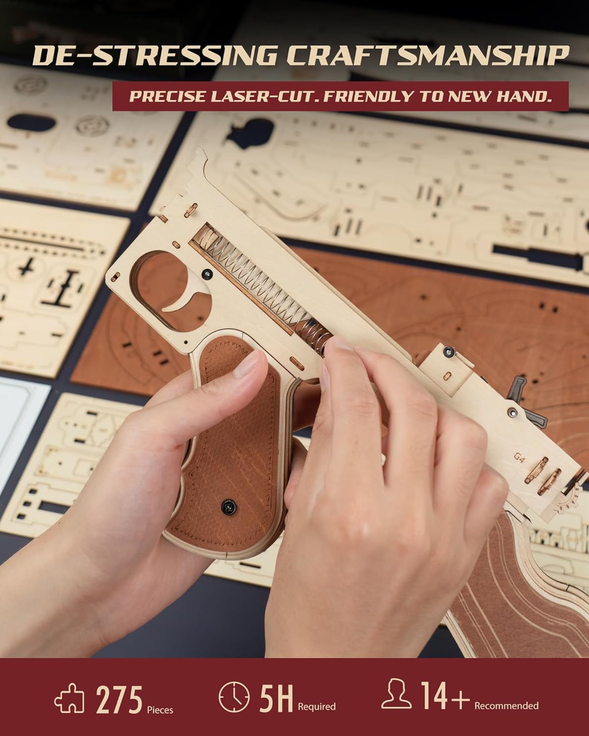 The LQB01 wooden gun toy can continuously fire 10 rubber bands. Detachable drum magazine is equipped with 10 wooden shells for distinctive throwing effect. It fires at high speed 5 per second, with shooting range of up to 8 metres. You can assemble this 3D puzzles and play it with family or friends.