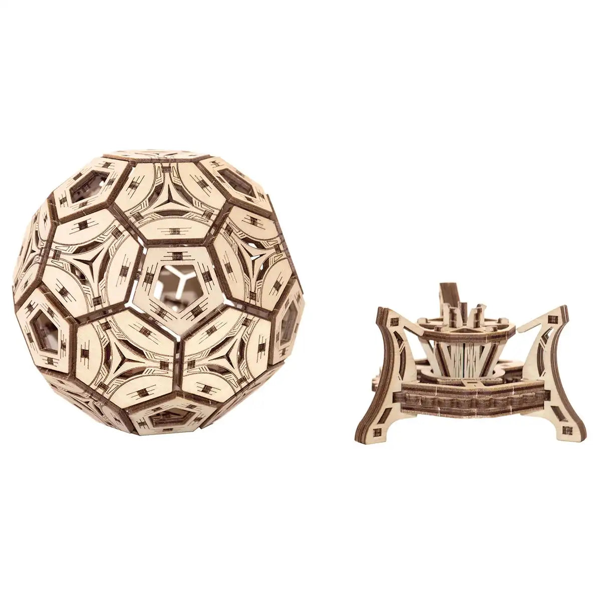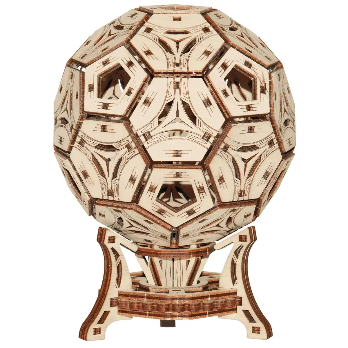 The 3D Wooden Puzzle journey invites you to immerse yourself in the creation of this multifunctional organiser. Crafted from Birch, the model evolves into a sturdy football-shaped unit that doubles as an interactive desk piece and a toy.