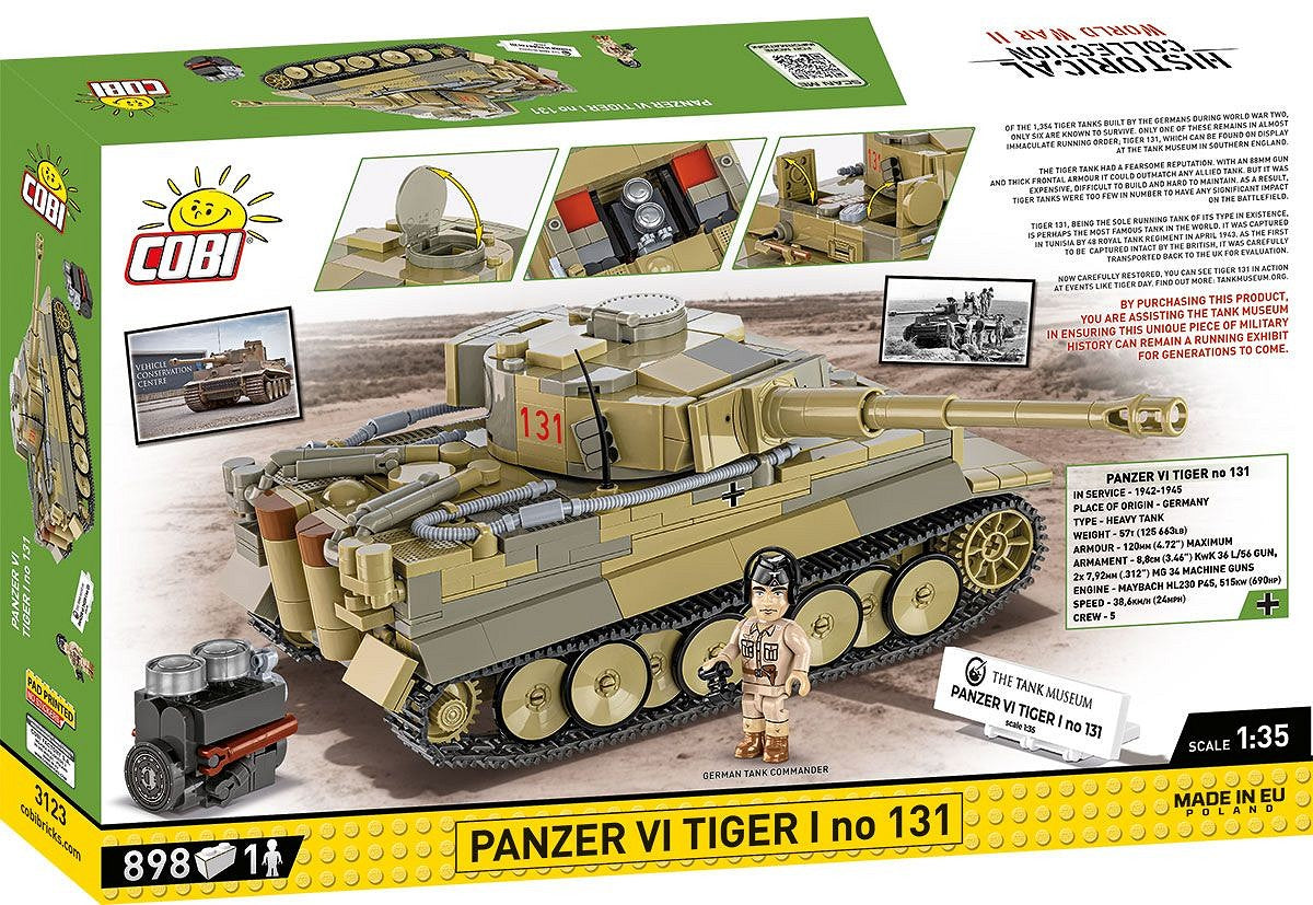 The block Tiger 131 has been reproduced with attention to detail in the very popular 1:35 scale! It is worth emphasizing that this is the first time COBI has released the legendary Tiger 131 in this size! The model has movable elements like the turret and gun barrel as well as rotating wheels and tracks. The elaborate set consists of 898 elements and faithfully reflects the original shapes of its historical inspiration. Our powerful block tank has been covered with high-quality prints that do not rub off. The colours, which are close to the original, deserve special attention, making the model look dazzling! The set includes a mini model of the Maybach engine, which can be displayed next to the model or placed in the tank under the service flap. The model has movable wheels and caterpillar tracks consisting of many links. During play you can drive the tank and watch the working caterpillar traction! The hatches are opened and there is space under them for standard COBI figures. The figure depicts the tank commander in tropical uniform. The whole set is complemented by a white plate with the name of the tank and The Tank Museum logo printed on it! Build history, piece by piece, and complete your Panzer collection.