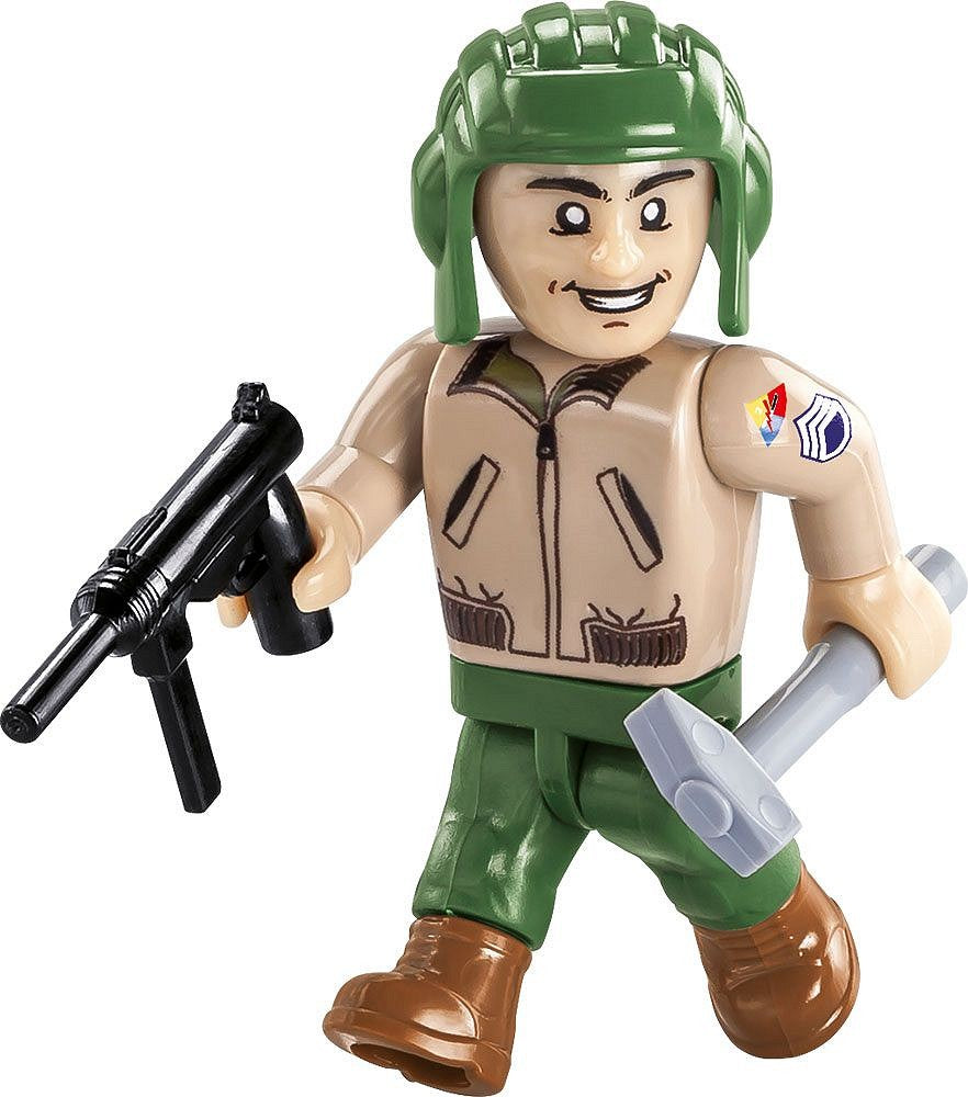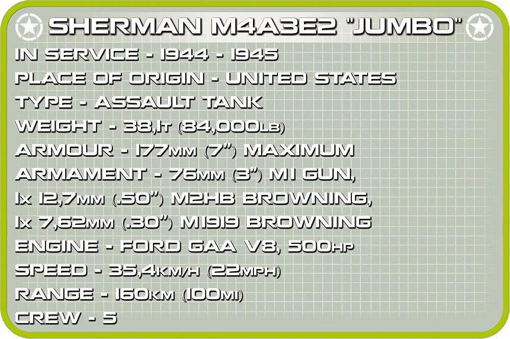 The Sherman M4A3E2 "Jumbo" is a short series of well-armoured tanks consisting of just 254 tanks. The Shermans were armed with a 75mm gun mounted on a modified M62 mount. The jumbo with its own name "Cobra King" was the one to receive the 76mm gun as well as the coaxial machine gun. It was issued to the 37th Tank Battalion, 4th Panzer Division at the end of October 1944 and was the tank of the commander of the C comrades. The tank became famous during the German offensive in the winter of 1944 in the Ardennes. It was the first to break through the German lines and reach the soldiers of the 101st Airborne Division surrounded in Belgian Bastogne. To commemorate this momentous event, the tank's crew painted a special graffiti, which was reproduced by the COBI with pad-printing. Some sources say that the tank took part in Operation Hammelburg, General Patton's secret mission, where it was destroyed in March 1945. For many years, the wreckage of the tank was exhibited on war memorials under incorrect markings. It was not until 2001 that military chaplain Keith Goode contributed to the uncovering of the true history of the anonymous wreckage. The tank has been painstakingly restored at The Patton Museum and is now located in Fort Benning, Georgia. In the Belgian Bastogne, however, a properly painted replacement for the famous Sherman "King Cobra" was installed.