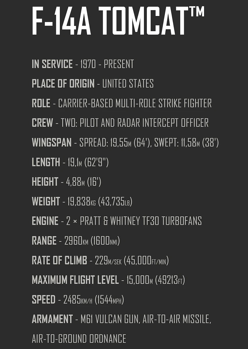 Movable wings with variable geometry - This is a key feature of the real F-14 and one of the most spectacular technical solutions in the history of aviation. In the model from COBI, the wings can be extended and folded - exactly like in the original - which allows for an effective presentation of the model.