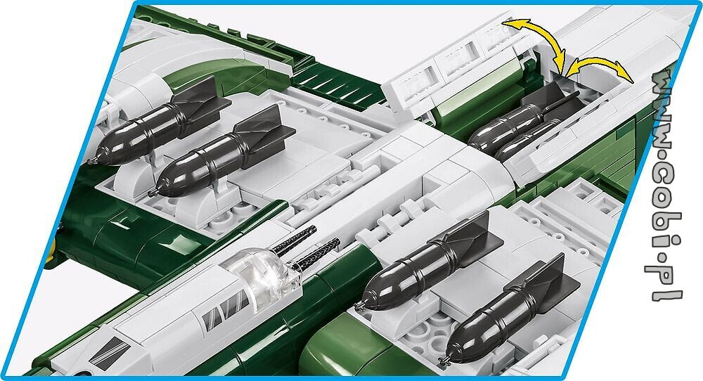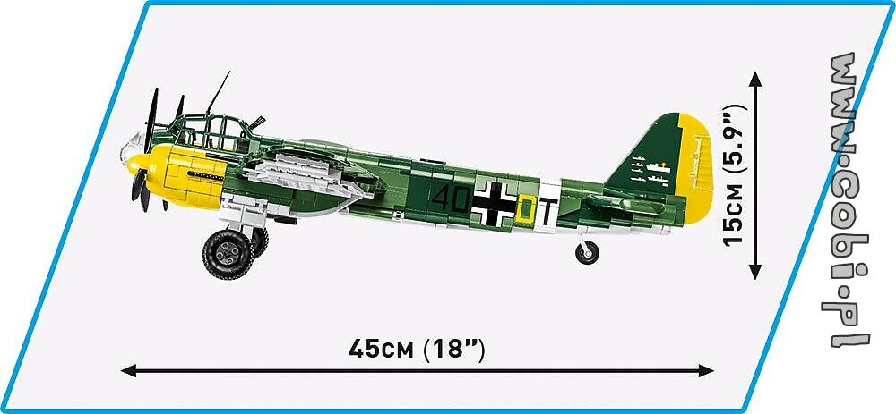 The COBI model of the famous Ju-88 bomber has been carefully developed with the use of 1,160 building blocks in the sensational large scale 1:32. The set includes only permanent prints. You will not find a single sticker here! To better reflect the complicated shape of the cockpit, we have developed new patterns of blocks! There is also a pilot figure in the cockpit. The set includes movable elements such as propellers, ailerons and bomb hatches. Detachable bombs and retractable wheels are underneath the wings. Thanks to the intuitive instructions based on clear illustrations, the construction is simple. The plane is a must for all fans of history, aviation, military and military technology.