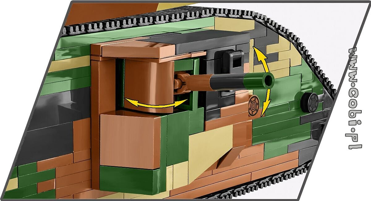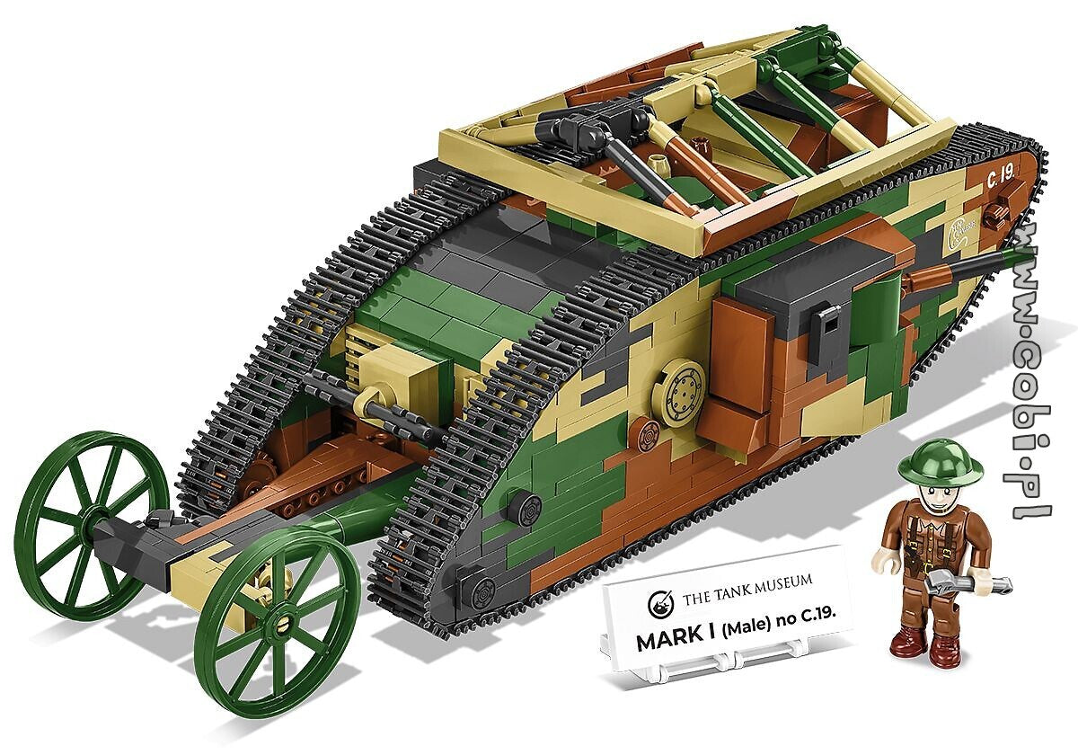 The British Mark I tank (Male version) was produced in 1916 during the Great War. It was one of the first tanks used in military history. The designation "Male" in the name meant that it was a variant of the tank equipped with a combination of cannons located in turrets on the sides of the vehicle and machine guns. The "Female" versions of this type of tank were equipped with multiple machine guns only. The vehicle was powered by a gasoline engine that allowed it to travel at speeds up to 4 miles per hour. It was slow and bulky, but its armour provided some protection against enemy infantry small arms. The Mark I (Male) no C.19. tank was first used in combat in 1916 at the Battle of the Somme during World War I. Its main goal was to break through enemy fortifications, destroy barbed wire and support the infantry in capturing positions. Although it was not a perfect combat vehicle, its presence on the battlefield played an important role in the evolution of war strategy. The Mark I tank is a must-have for history and armour enthusiasts and a beautiful model for a collection dedicated to the Great War. Build history, piece by piece, with COBI.