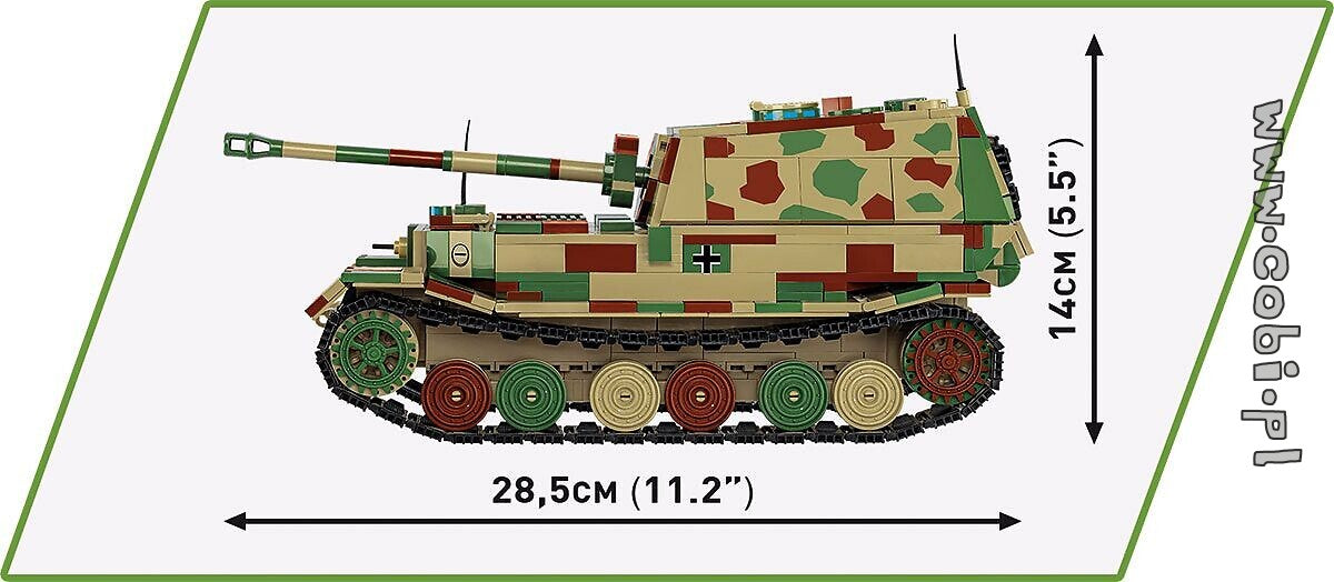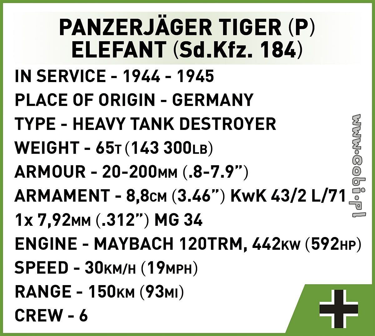 The first version of the German heavy tank destroyer was named Ferdinand after its designer Ferdinand Porsche. A slightly improved version of this vehicle equipped with, among other additions, a machine gun in the front and a commander's cupola was called the Elefant. COBI has designed both versions!