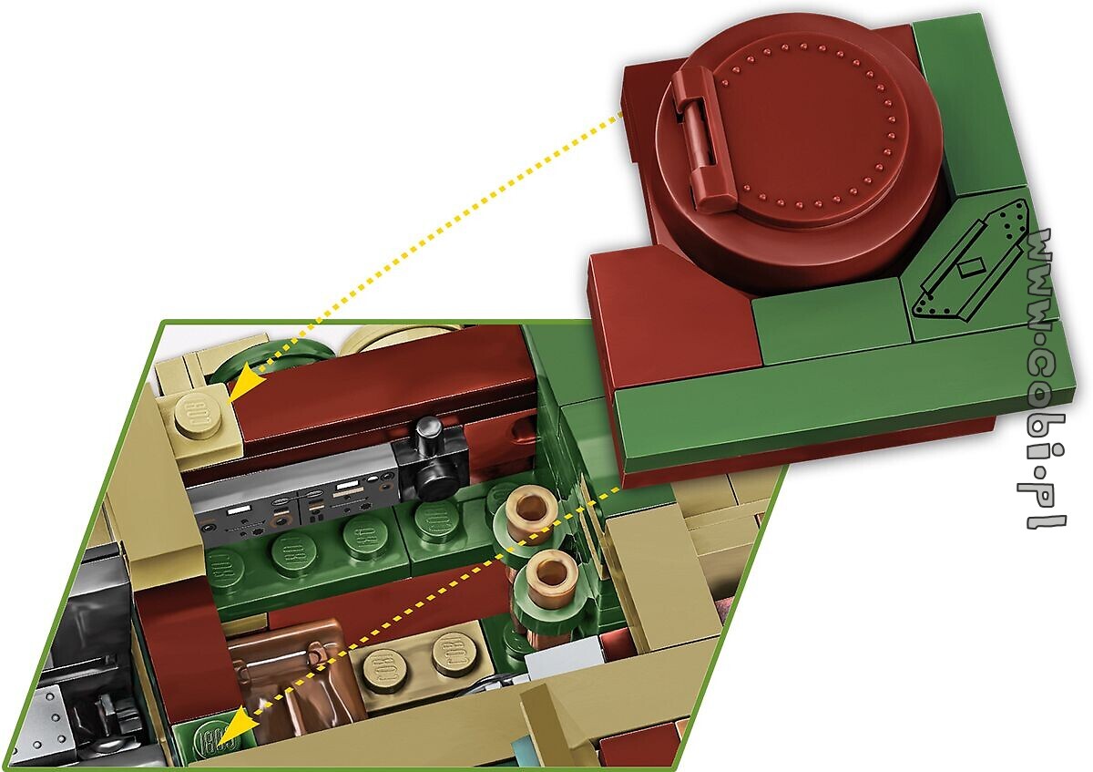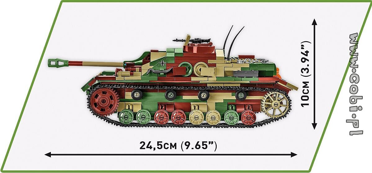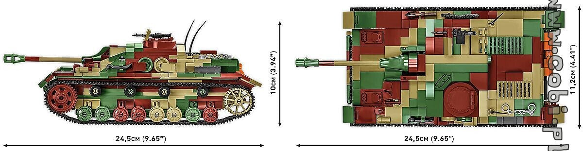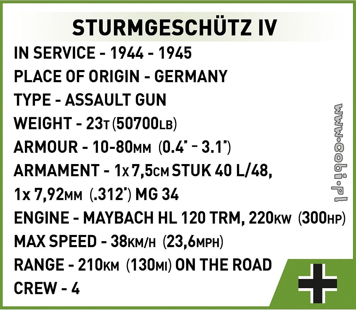 The StuG IV block model was developed in the large 1:28 scale using 952 elements and measures 24.5 cm in length. The large size of the model made it possible to recreate details of the vehicle's interior and design a beautiful block camouflage. The model offers access to the service hatch, under which there is a removable engine. Additional functionalities include: the cannon, which can also be moved sideways, access to hatches for the crew and working tracks. The model uses only high-quality, durable prints.