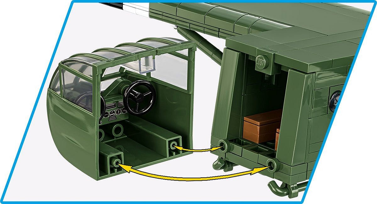 The 1:48 scale block model includes a new block: the glider's nose, which looks exactly like the real one! Inside you can place the figure of the American pilot included in the set. The model features high-quality prints and matches the size of the released set of the Douglas C-47 Skytrain Dakota aircraft. Together, both sets can comprise an extraordinary aerial duo recreating D-Day! Will the Dakota tow the WACO CG-4 in your collection? Build history, piece by piece, with COBI!