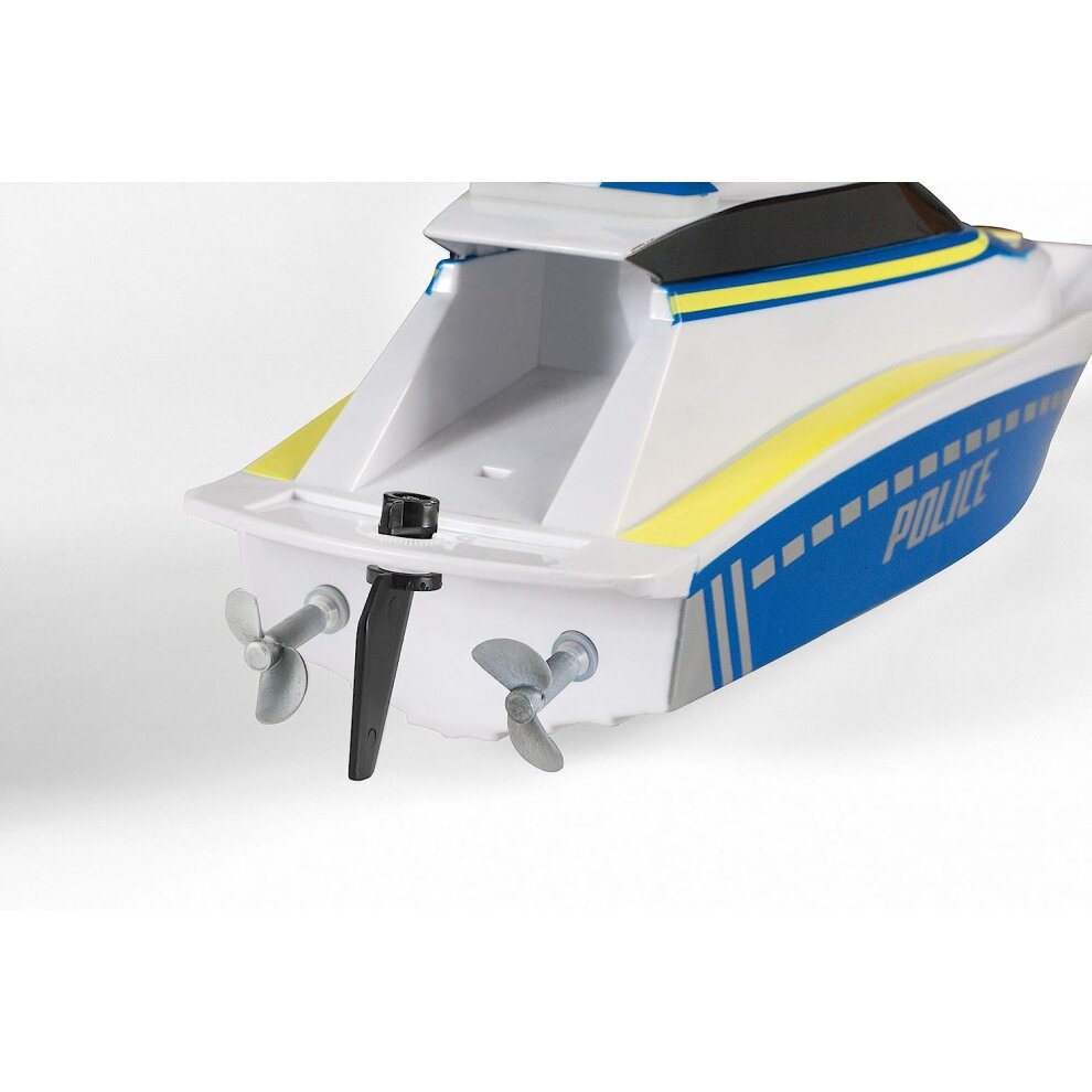Criminals don't stand a chance here! With the fast and agile police boat you control the waters. Two electric motors and the integrated Li-Ion battery provide the necessary power and a long driving time. Thanks to the included USB charger, you are always ready for action again. The completely encapsulated electronics are protected from water penetration even during wild driving manoeuvers. The 2.4 GHz technology lets you control boats with multiple friends at the same time without interfering with each other. The included protection circuit prevents the propellers from starting up out of the water. So there is no risk of injury.