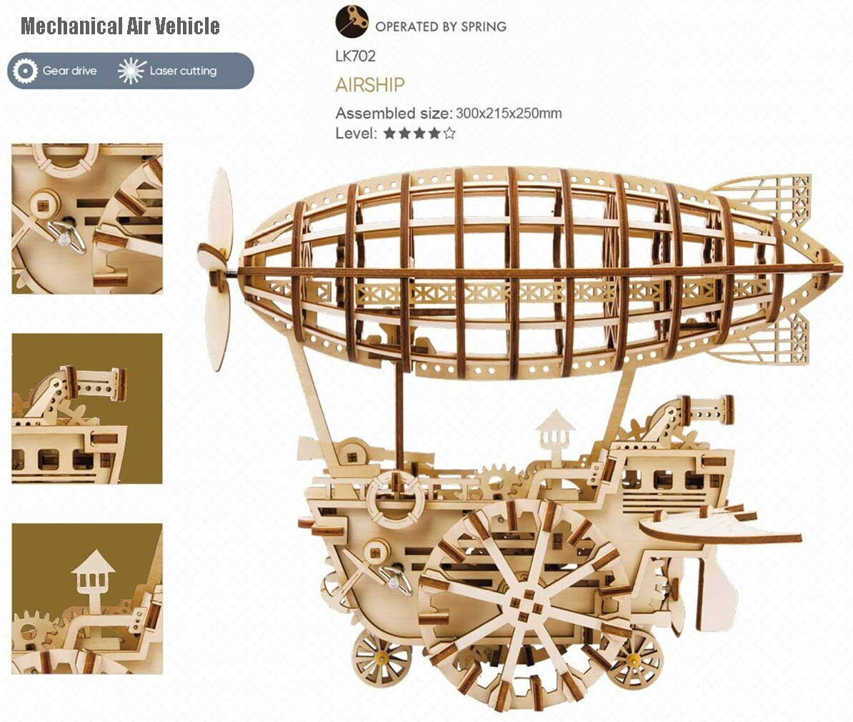 Robotime-ROKR airship model 3D wooden puzzle is powered by a wind-up spring. It has a retro steampunk feel with a delicate wooden skeleton. Exercise your mind by constructing gears and aircraft. Watch it shooting out with its spinning propellers!