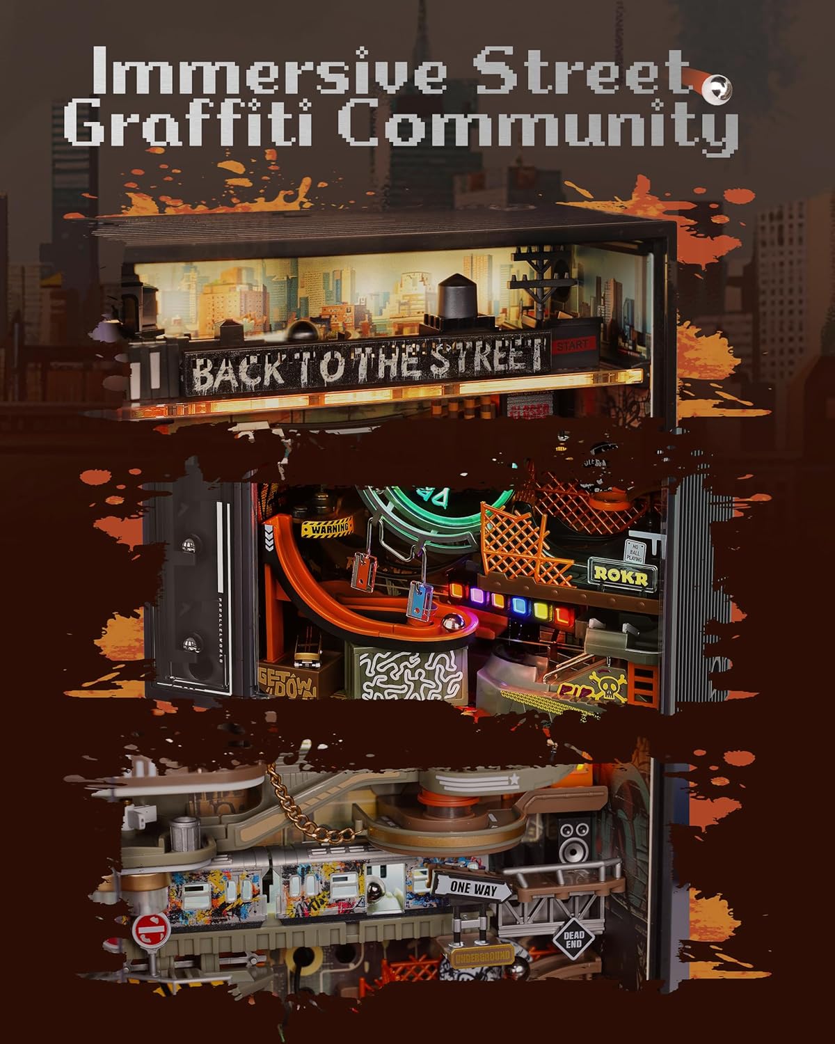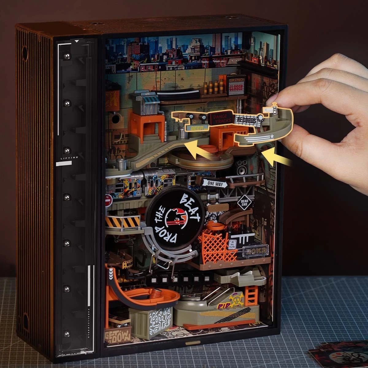 It’s not just about style and swag, be pleasantly surprised by the six internal light boxes that react to ambient sounds, creating flashing effects even after the metal marbles have stopped rolling. With over a hundred randomised lighting sequences, it’s as entertaining and eye-popping as a beatbox battle! As a new addition to ROKR’s Parallel World series, it seamlessly connects with The Last City and The Future City, allowing you to expand your futuristic marble run set with ease.