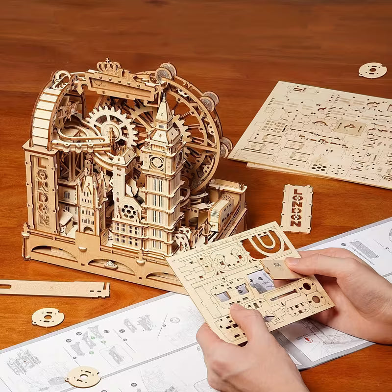 Construct London’s famous attractions like the London Eye, Big Ben, and the Tower Bridge with this DIY 3D wooden puzzle marble run, then travel through them in a speedy, adrenaline-filled journey.