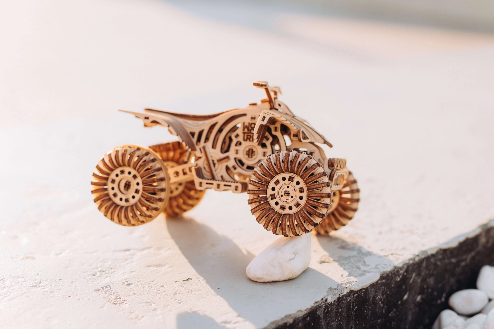 The Raptor Quad Bike's finished model is composed of 339 components. All WoodTrick models have the benefit of being environmentally friendly. We use wood veneer for all of the parts, and no glue is used to join them together. As a result, our wooden models are safe for you to assemble and play with while not damaging the environment.