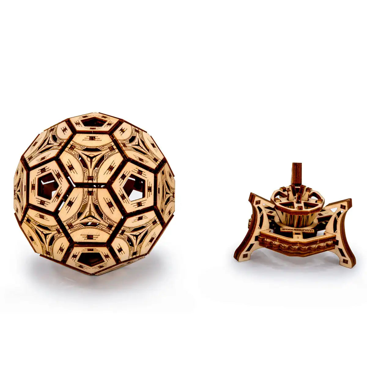 The 3D Wooden Puzzle journey invites you to immerse yourself in the creation of this multifunctional organiser. Crafted from Birch, the model evolves into a sturdy football-shaped unit that doubles as an interactive desk piece and a toy.
